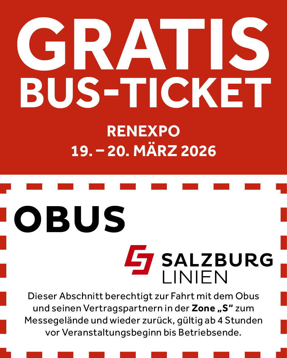 Ihr Renexpo Tagesticket berechtigt zur gratis Anreise mit dem Salzburger Obus zum Messezentrum Salzburg.